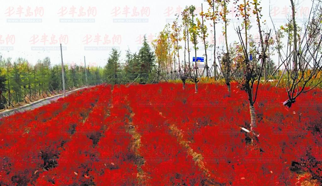 緩坡上栽植的金焰繡線菊鮮紅似火。