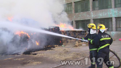 消防官兵到達(dá)現(xiàn)場后,發(fā)現(xiàn)是一稻草繩垛起火燃燒,過火面積較大,草繩垛東邊是一車庫和居民區(qū),南邊為廠房,西邊和北邊為空地。根據(jù)現(xiàn)場火情,指揮員下令:一號車在草繩垛東北角出一條干線一出水,二號車在草繩垛西北角出一條干線一出水,阻斷火勢向北邊未起火的草繩蔓延,對火勢進(jìn)行控制;鑒于現(xiàn)場起火物火災(zāi)性質(zhì)及當(dāng)前火勢,中隊與指揮中心聯(lián)系請求增援,以保證火場用水;同時由于起火的草繩垛體積較大,無法用人力進(jìn)行翻刨,指揮員通知報警人立即聯(lián)系大型鏟車或挖掘機(jī)在起火與未被引燃的草垛間制造隔離帶阻止火勢蔓延,并對起火草垛進(jìn)行翻刨。