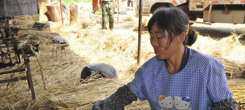 然后,把經(jīng)過適當(dāng)“回潮”后的稻草按長短多少適量的用手一把把的送入專用的搓繩機(jī)開始搓繩子。搓繩機(jī)有兩個(gè)喇叭口形狀的進(jìn)料口,送料的時(shí)候需要兩邊同時(shí)均勻的送料。隨著機(jī)器不停的旋轉(zhuǎn),一根草繩就搓出來了。搓出的草繩被自動纏繞在一個(gè)圓形的繩盤上。等到一個(gè)盤子繞滿后,就可以停下機(jī)器把已經(jīng)盤成一盤的草繩卸下來。再開始下一盤草繩的搓制工作。