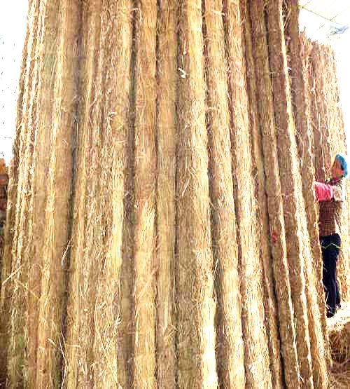 稻夫草支墊提出的在草支墊上固定鋼卷的連接件是以草支墊本身的捆帶作為捆綁點(diǎn),并且可選擇靠近鋼卷的捆帶,該種連接件一方面可以節(jié)省纏繞草支墊部分的捆扎帶,另一方面,捆綁鋼卷部位的捆扎帶可以呈倒U形,使其兩個(gè)邊基本傾斜,故可節(jié)省因傾斜而延長的那部分捆扎帶;因草支墊本身的捆帶是由捆扎機(jī)形成的,非常緊固,所以,用其作為捆綁點(diǎn)不會(huì)出現(xiàn)松動(dòng)及脫落等現(xiàn)象;另外,連接件采用對折矩形框的結(jié)構(gòu)操作非常方便,可直接降低包裝和操作成本。
