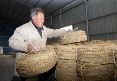 鄧莊村草品廠(chǎng)工人在堆放用稻草打成的草繩