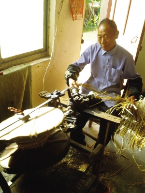 “草繩大王”名叫楊建民,家住雅橋村11組。盡管已經(jīng)74歲,他卻耳聰目明,精神矍鑠。記者來到他家中時(shí),他正在和老伴一起晾曬小麥。楊建民老人將記者帶到了自己的“生產(chǎn)車間”。原來,這只是一間不到20平米的屋子,設(shè)備僅有一臺(tái)草繩機(jī)。草繩機(jī)旁還有一些尚未加工的稻草,在屋子的一角,有10多捆已經(jīng)制成的草繩堆在那里。老人告訴記者,這些草繩已經(jīng)被人預(yù)定了,過些天他將送貨上門。