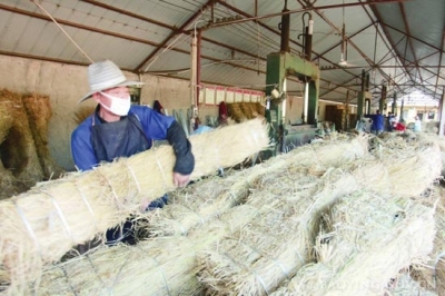 位于寶應(yīng)曹甸鎮(zhèn)的揚(yáng)州聯(lián)農(nóng)包裝材料有限公司是一家稻草壓制企業(yè),工棚里,2臺(tái)稻草壓制機(jī)正在運(yùn)行,工人把稻草順成小捆,一扎一扎地放入壓制機(jī)中,5分鐘不到,一個(gè)長(zhǎng)約2米,寬、高各約50厘米,兩頭寬中間凹的枕木狀成品就初步加工完畢,后續(xù)還要用鋼絲和鋼管進(jìn)行加固。“我們這個(gè)產(chǎn)品密實(shí)度高、彈性好,主要銷往上海等地的鋼鐵加工企業(yè),在鋼鐵制品運(yùn)輸過(guò)程中代替原來(lái)的木料,起到固定、減震作用,不但減少木材消耗,而且利用稻草制作價(jià)廉物美啊!”企業(yè)負(fù)責(zé)人介紹,“由于今年夏季氣溫低、雨水多,寶應(yīng)稻子開(kāi)鐮較遲,淮安那邊的稻草沒(méi)有運(yùn)過(guò)來(lái),我們稻草堆場(chǎng)還很空,機(jī)器都沒(méi)有吃足。”據(jù)了解,一家這樣的企業(yè)一年可以消耗10000噸稻草。
