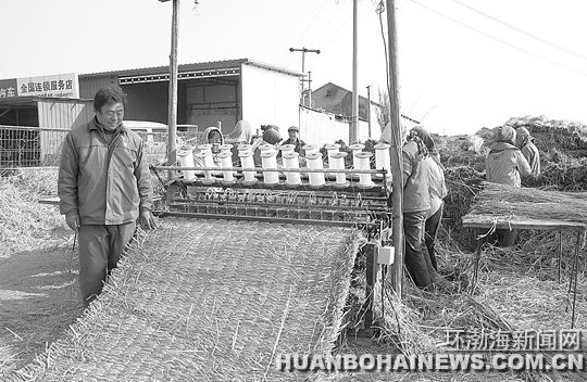 每到水稻收割的季節(jié),樂亭縣的草簾加工業(yè)便紅紅火火地開展起來,作為果菜大縣,每到冬季為蔬菜大棚保暖的草簾就有大量需求。草簾加工機器結構簡單,操作方便,是加工致富的好門路,每臺機器一季能收入3-5萬元。圖為新寨一村的村民在加工草簾。