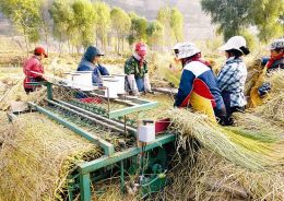 10月26日,左權(quán)縣東安村婦女在地頭加工草簾、就地出售。該村通過(guò)信用社小額貸款的扶持,購(gòu)置了小型加工草簾機(jī)器,把過(guò)去丟棄的稻草加工成溫室保溫草簾和工程保溫用品,增加了農(nóng)民收入。