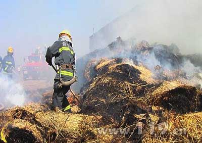 消防官兵到達現(xiàn)場后。經火情偵察發(fā)現(xiàn),燃燒物是一草簾堆垛起火,火勢處于發(fā)展階段,南側民房受到火勢威脅。根據(jù)火場情況,消防指揮員立即下令:一班東風水罐車出一支水槍從火場的東側利用直流水槍對著火部位射水,及時阻止火勢的蔓延發(fā)展;二號車組織為一號車供水。經過近1小時30分鐘的緊張撲救,大火于16時20分被徹底的撲滅,確保完全熄滅沒復燃的可能,消防官兵才撤離現(xiàn)場。
