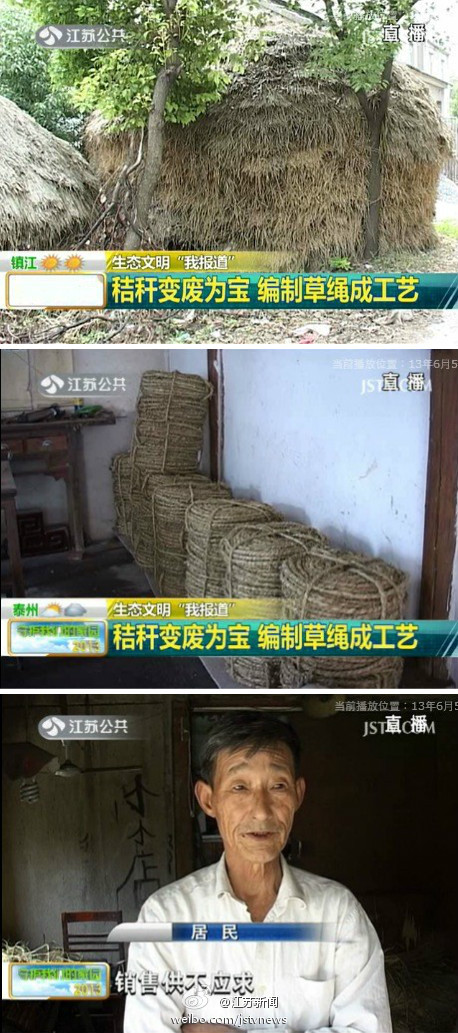 發(fā)布:2013-06-05 13:40:43作者:江蘇新聞#江蘇公共環(huán)境日直播#【稻草變廢為寶 編制草繩成工藝】又到了夏季小麥收成的季節(jié),焚燒稻草的問題也是年年禁年年有,可是在南京溧水區(qū)晶橋鎮(zhèn)水晶村,稻草可成了寶貝。村里的老人家?guī)缀跻跃?a href='http://carbonlunar.com/case/caosheng/35.html' target='_blank'>草繩為生,很多商戶都會來收購草繩,提供給陶瓷公司、苗木公司,用來運送陶瓷、苗木,如今可是供不應(yīng)求哦!