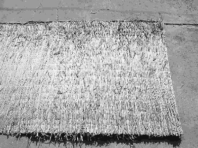 收購部門對草簾子的質(zhì)量要求并不高,只要一個草簾子有3.3長、1米寬、10公斤重即可。打草簾子的技術要求并不復雜,只要稍稍用心學一學,就可操作。它的操作過程是,先在較平坦的地面上固定好三根底繩,然后再準備好系草把所用的繩子,無論是底繩還是用來系草把的繩子,都像做布鞋底子所用之繩那樣粗細即可。將玉米稈一樣粗細的草把,一把一把的放在底繩上面,再用繩子一把一把地將草把系在底繩上,草把之間要靠緊,一直將草把系得夠長、夠?qū)?、夠重,就算打成一個草簾子。