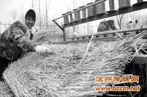 冬閑時節(jié),過去往往被當(dāng)作廢棄草料扔掉或燒掉的稻草,在博興縣店子鎮(zhèn)農(nóng)民的手中卻變成了“寶貝”,他們從外地購進稻草,使用草簾機將稻草編織加工成草簾、草苫等外銷,既避免了焚燒稻草對環(huán)境造成的污染,又增加了收入。目前,稻草加工已成為該鎮(zhèn)的一個產(chǎn)業(yè),在這個產(chǎn)業(yè)的幫助下,全鎮(zhèn)人均增收500多元。