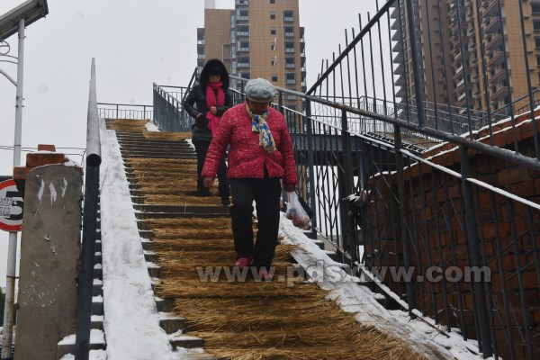 據(jù)了解,一場雪后,鐵制的天橋上積了一層厚厚的雪,為了防止行人過天橋時滑倒,有人在天橋兩側(cè)的臺階和橋面上鋪上了草苫。記者詢問了附近多位居民和過路人,大家都不知道是誰鋪的草苫,但都向不知名的熱心人表示感謝。