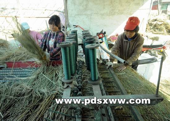 11月12日,湛河區(qū)曹鎮(zhèn)鄉(xiāng)銀王村的幾位村民在王文志的作坊內(nèi)加工草苫子。王文志于2006年購(gòu)置器械開(kāi)始加工草苫子。秋種結(jié)束后,他就雇用村民利用農(nóng)閑時(shí)節(jié)加工草苫子。今年10月份以來(lái),他的小作坊雇用同村8名村民加工出不同規(guī)格的草苫子5000條,消耗近400畝的稻谷稻草,獲利近萬(wàn)元。