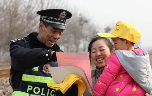 1月31日,在山西永濟(jì)市孫常火車站,民警向返鄉(xiāng)途中的一對母女發(fā)放安全宣傳材料。當(dāng)日,山西臨汾鐵路公安處開展“送安全送溫暖”活動,組織民警到人員密集的車站等場所,宣傳春運(yùn)安全,為旅客提供服務(wù)與幫助。新華社發(fā)(鮑東升 攝)