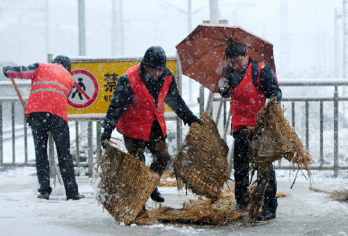 江西九江火車站站臺上清掃積雪、鋪設(shè)草袋